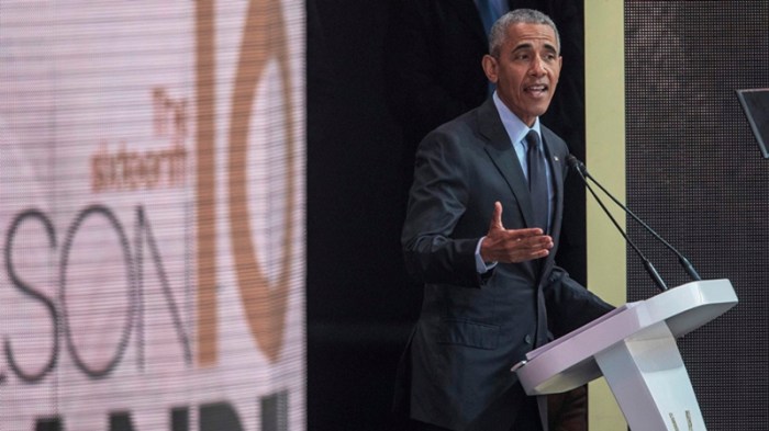 Former US President Barack Obama speaks during the 2018 Nelson Mandela Annual Lecture at the Wanderers cricket stadium in Johannesburg on July 17, 2018.